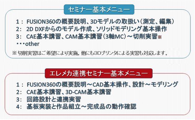 FUSION360のCAD、CAM、CAEの基本操作のカリキュラムと、基板CAD機能「Electronics」を使ったエレメカ連携基礎まで含めたカリキュラムを用意しています。